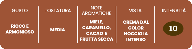 Miscela di caffè sudamericani dal gusto ricco, con note di miele, caramello, cacao e frutta secca.Il suo equilibrio tra amaro e dolce è una piacevole sorpresa.