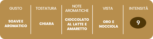 Miscela di caffè Arabica del Sud America. Ha un aroma floreale e al gusto denota una piacevole acidità e note di cacao. Il corpo risulta persistente al palato e lascia un ricordo di cioccolato al latte e amaretto.