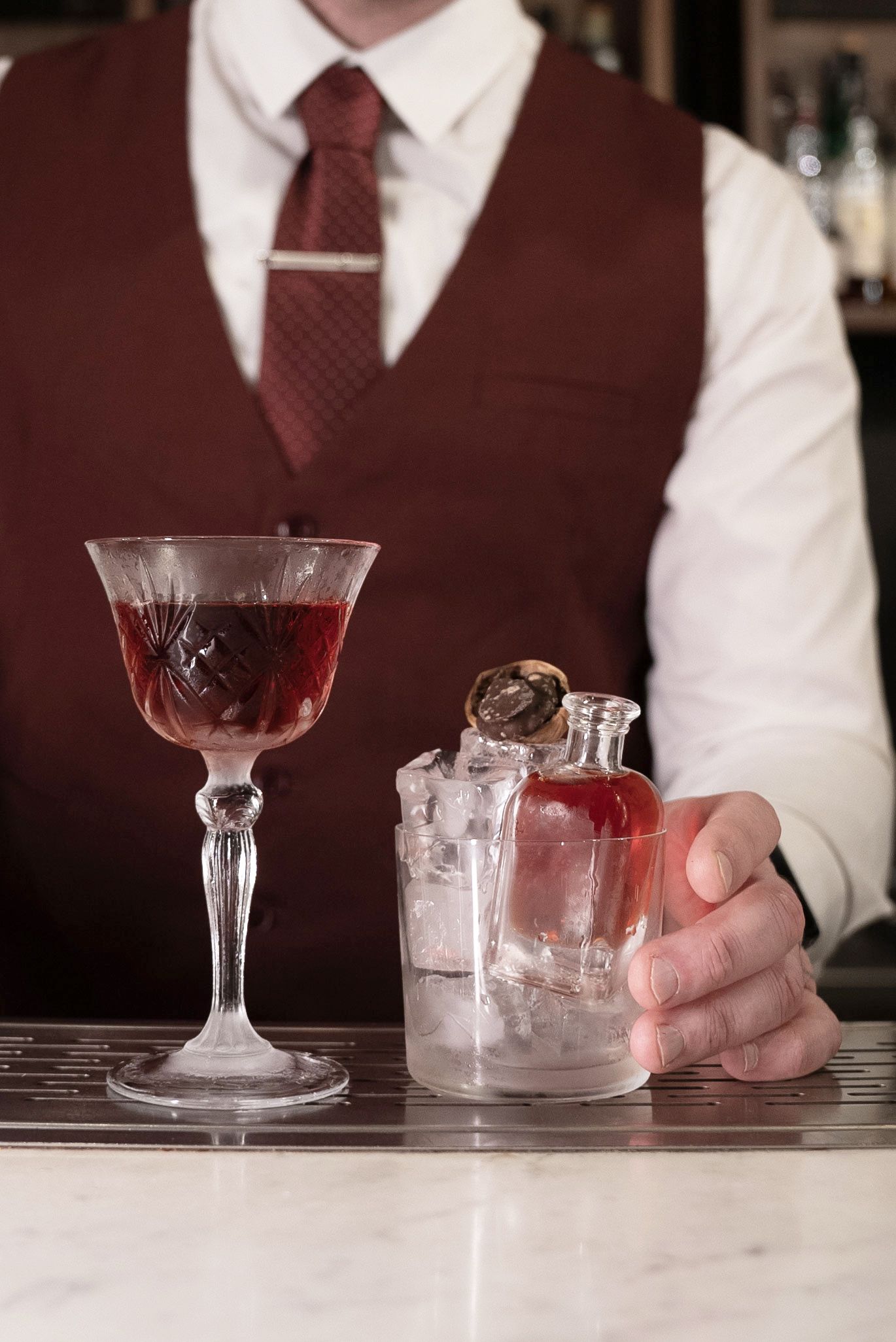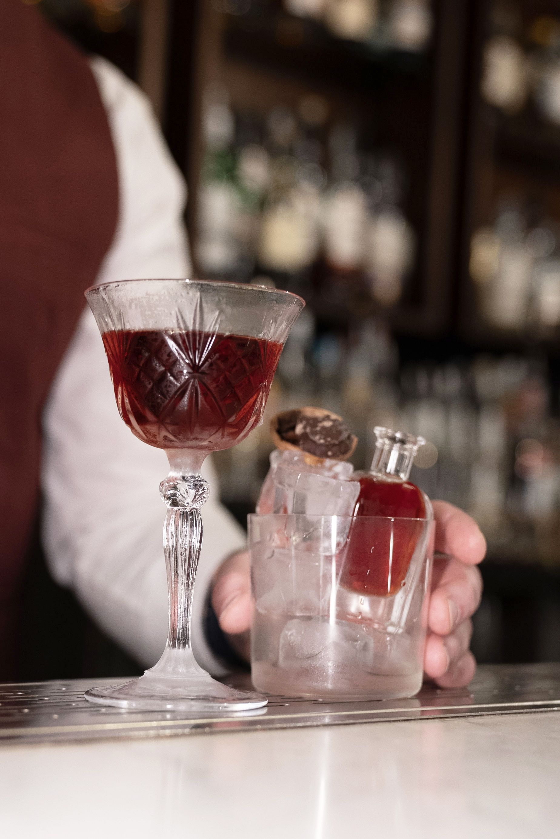 “L’altro drink è una rivisitazione di un classico Boulevardier, in questo caso un coffee boulevardier, perché andiamo a fare un’infusione del chicco di caffè in un bitter, la parte essenziale del drink. A questo viene abbinato un Vermouth e del whisky americano infuso alle noci. Quindi un drink classico con un forte sentore di caffè e noci”.